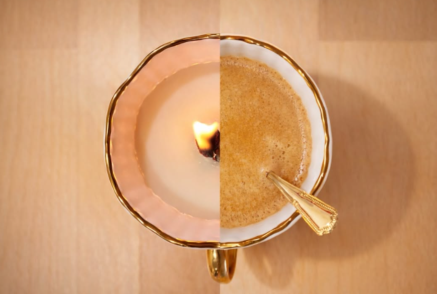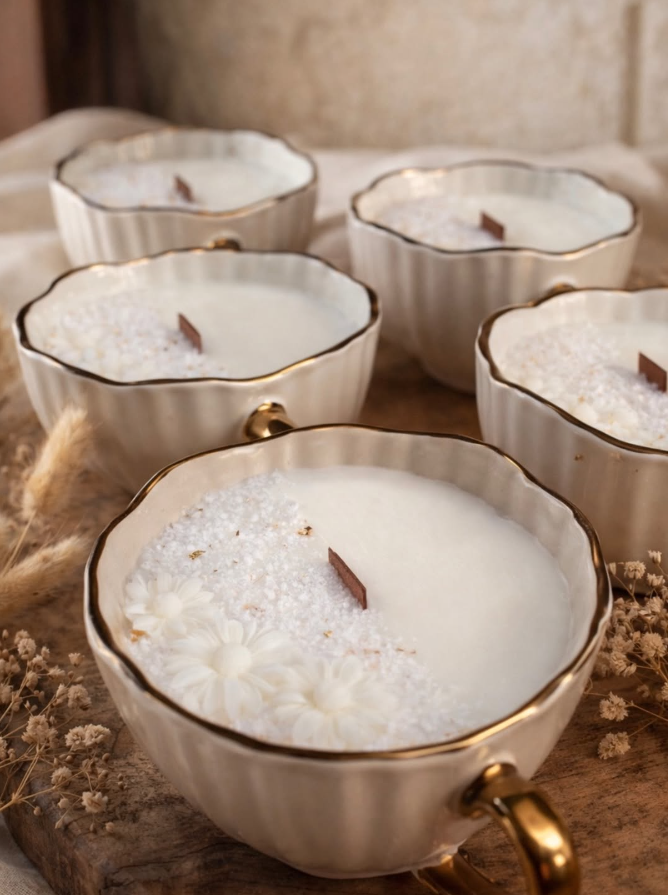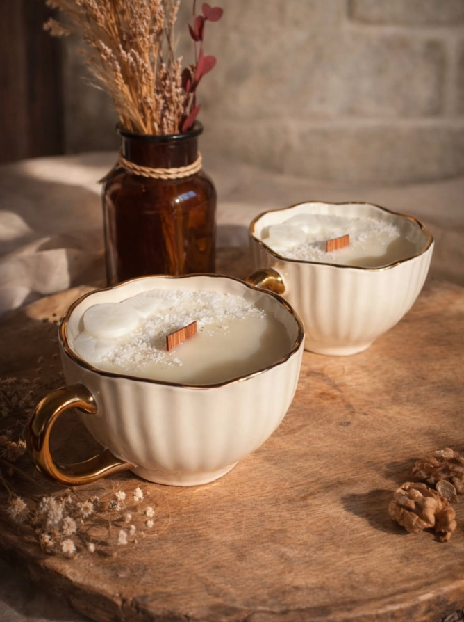 Des créations artisanales en cire végétale Soja-Coco, dans des tasses en céramique réutilisables.
